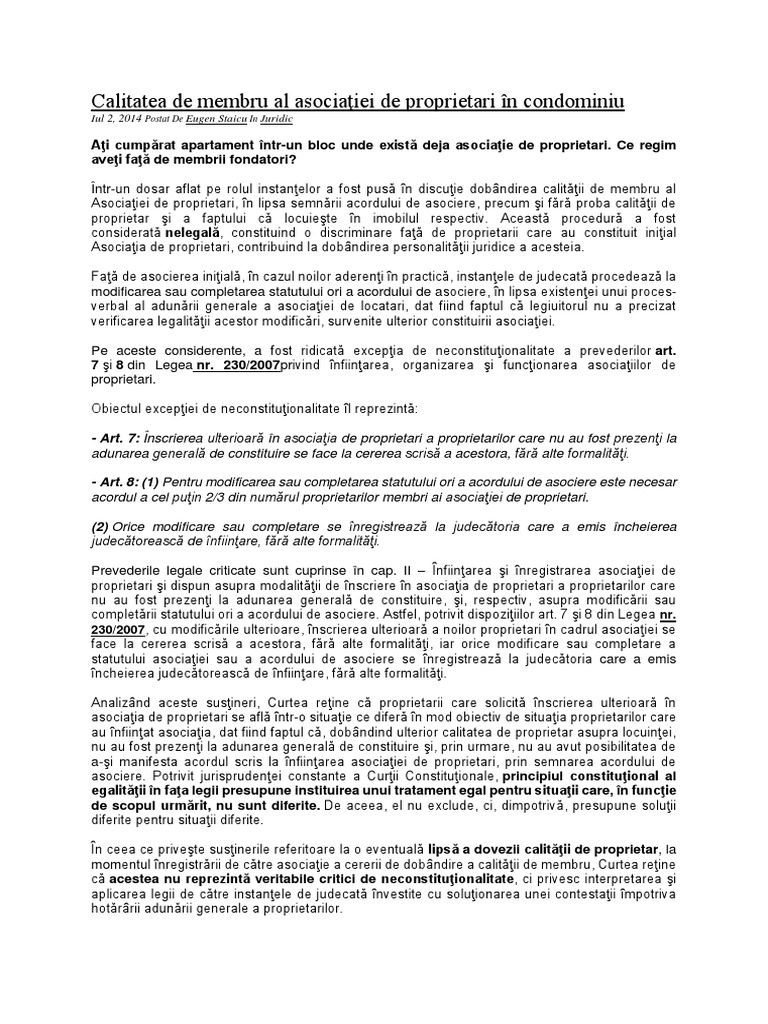 230 din 6 iulie 2007 (*actualizata*) privind infiintarea, organizarea si functionarea asociatiilor de proprietari (actualizata pana la data de 23 iulie 2010*) emitent: (2) prezenta lege se aplică proprietarilor, chiriașilor, asociațiilor de proprietari și asociațiilor de chiriași din condominii. Propunere legislativa vizeaza modificarea si completarea legii nr.196/2018 privind infiintarea, organizarea si functionarea asociatiilor de proprietari facilitarea includerii unor noi membri, ulterior formarii asociatiei.